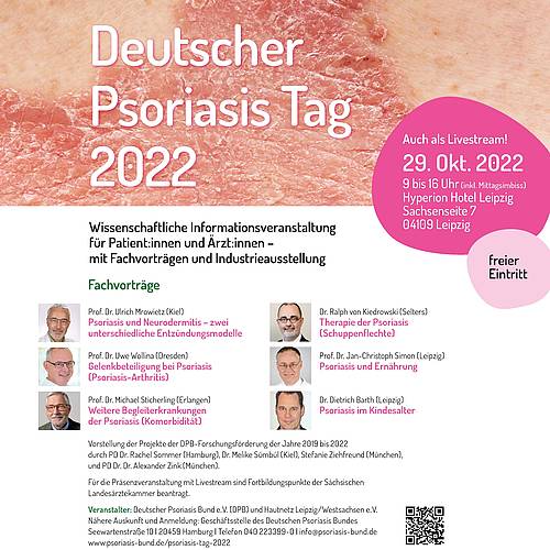 Anlässlich des Welt-Psoriasis-Tages 2022 laden der Deutsche Psoriasis Bund (DPB) und das Hautnetz Leipzig/Westsachsen in Kooperation mit dem Berufsverband der Deutschen Dermatologen (BVDD), der Deutschen Dermatologischen Gesellschaft (DDG) und den Regionalen Psoriasisnetzen in Deutschland (PsoNet) sehr herzlich zu einer wissenschaftlichen Informationsveranstaltung für Patient:innen und Ärzt:innen mit Fachvorträgen und Industrieausstellung ein. Die Teilnahme - sowohl an der Präsenzveranstaltung als auch per Livestream - ist kostenfrei.